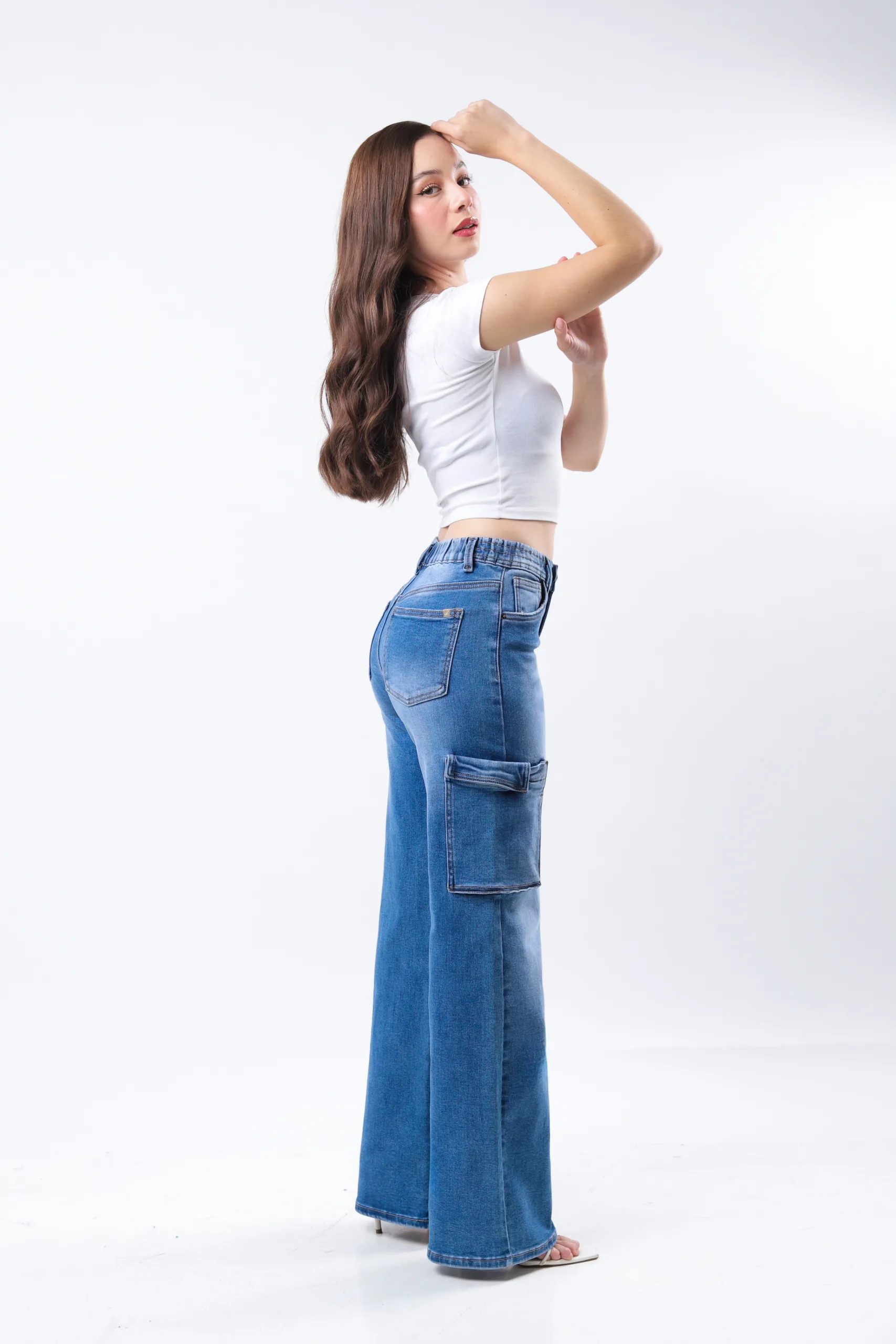 PANTALON KYRAT MODA JOGGER WIDE CARGO MEZCLILLA AZUL MEDIO CLARO