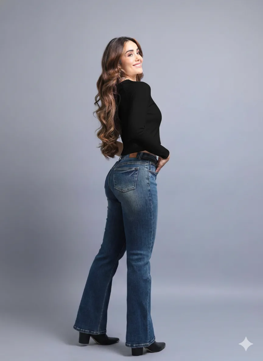 Ajustado en muslos, con ligera apertura desde la rodilla para usar con botas.